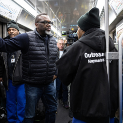 In February, Mayor Brandon Johnson and WGN News correspondent Tahman Bradley experienced firsthand the work that Haymarket Center has been doing to assist those experiencing homelessness seeking shelter on the CTA by joining our outreach team for an 11 p.m. ride-along as we provided services on the Blue Line.