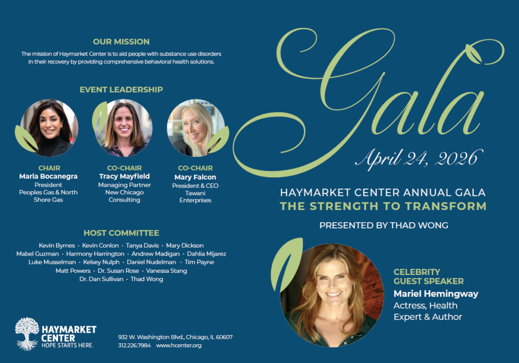 Celebrate the strength to transform at the 5th annual Haymarket Center Gala. Join us for an inspiring evening where we honor our history and share our vision for a future full of hope and recovery. This special event recognizes the partners and supporters who make life-changing transformation possible. Guests will enjoy a celebrity speaker, a delicious dinner, meaningful conversations about substance use disorder, and more.